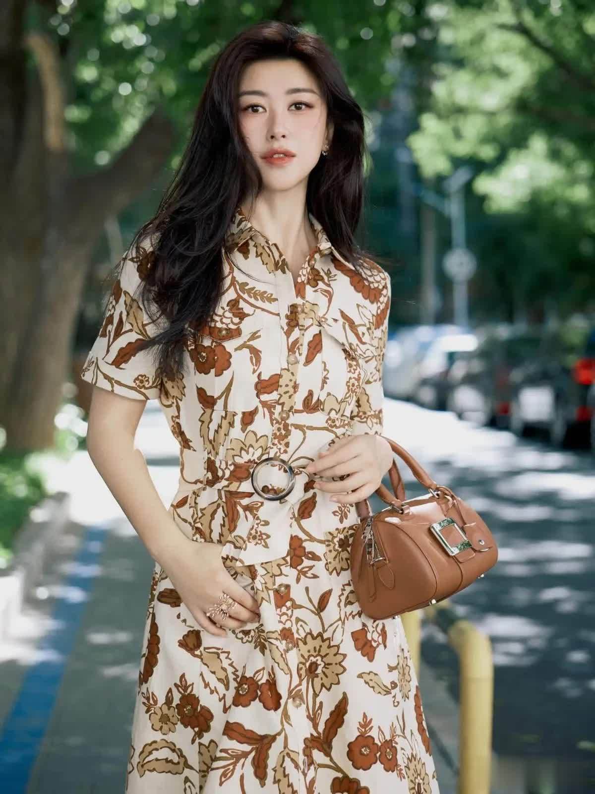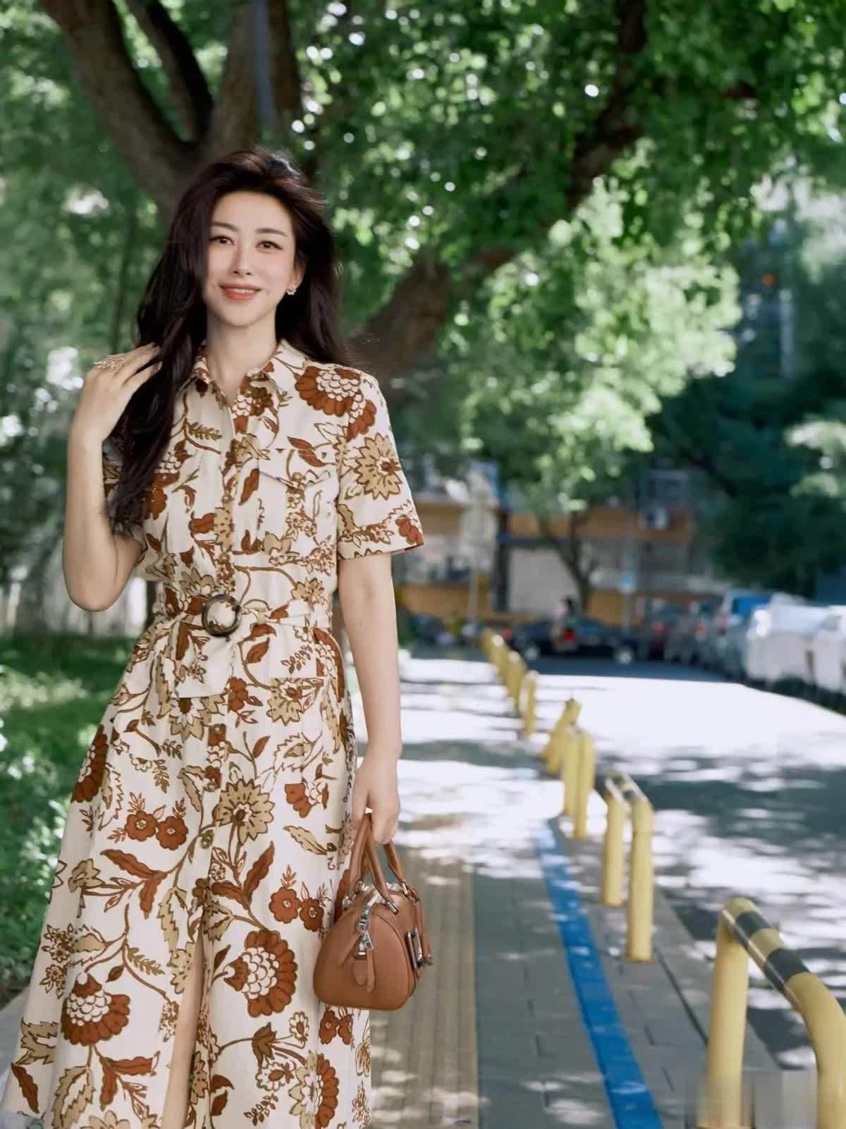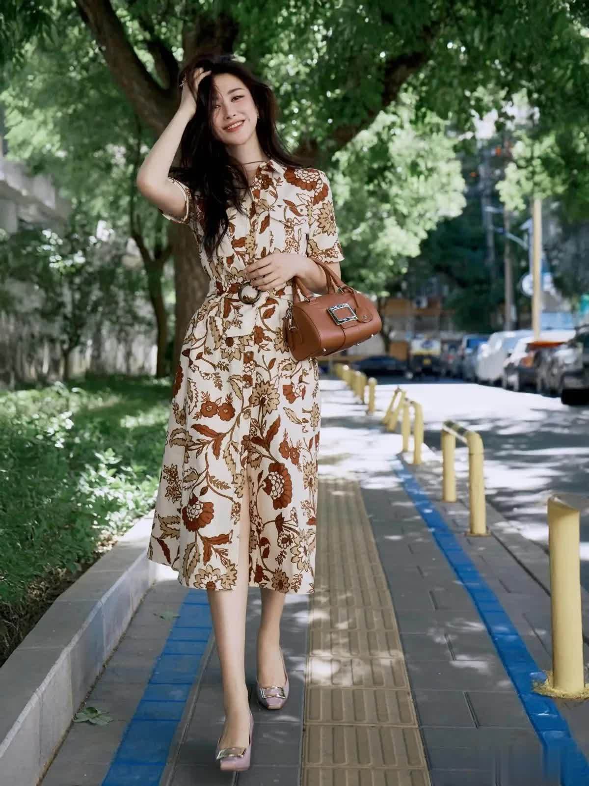 再看这一身搭配,朱珠用一条米白色的棕调花卉衬衫连衣裙,把法式慵懒与东方韵味完美融合。裙身以奶白色为基底,印满复古棕调的大朵花卉图案,暖棕与米白的撞色自带复古滤镜,不会像高饱和印花那样张扬,又能在人群中脱颖而出,完美适配春夏的阳光氛围。
